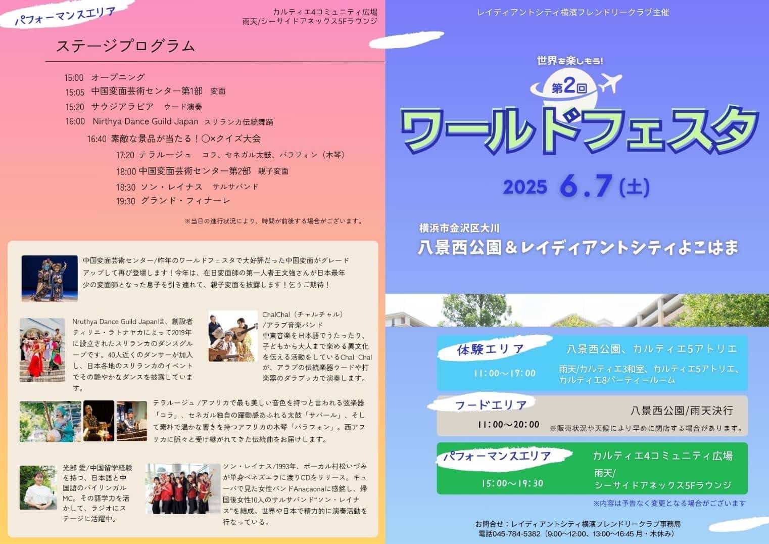 | ■2025/ 6/ 7 (土) 第2回ワールドフェスト @八景西公園&レイディアントシティよこはま(https://www.instagram.com/explore/locations/142609372939170/) |